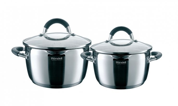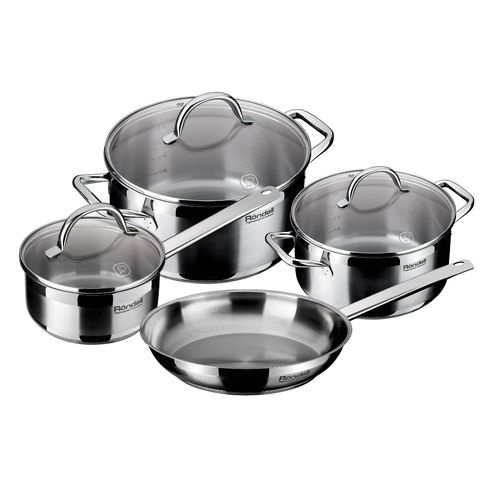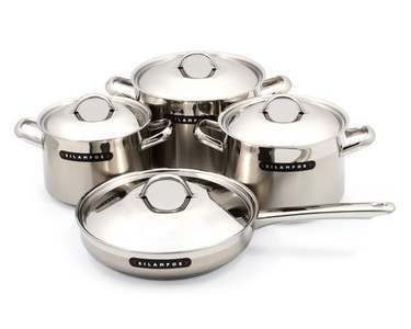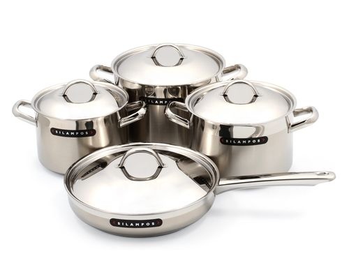 Стальной набор из трех кастрюль и сковороды с термораспределяющим дном.